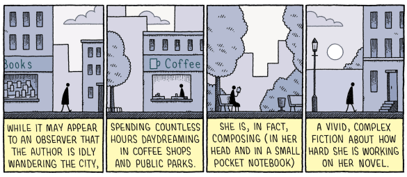 As this Tom Gauld comic strip shows, those writers who appear to be simply killing time by wandering about, pondering, wandering some more, are in fact working very hard on their writing.